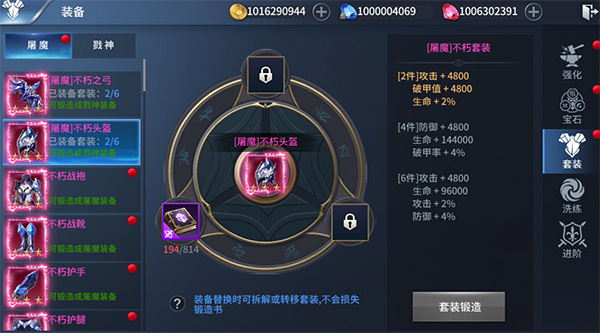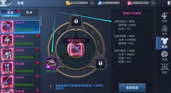 套装效果在锻造的套装数量达到2件/4件/6件的时候可以激活,套装界面的右边可以查看具体的效果。