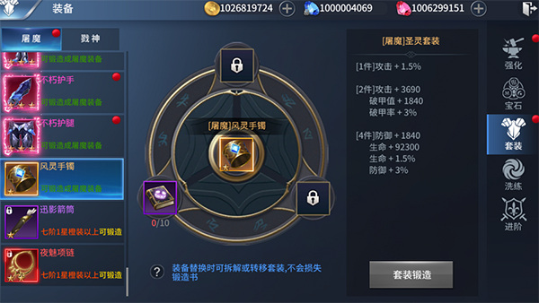 然后戒指、手镯、项链、副手可以锻造为特殊的圣器套装,套装激活数量达到1件/2件/4件的时候可以激活套装效果。