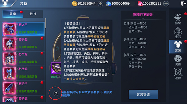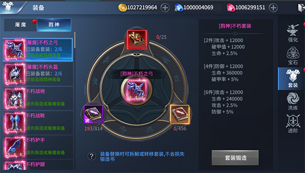 套装有两种类型,最初锻造的屠魔套装还可以进阶为更为强大的戮神套装。锻造戮神套装所需的完美锻造书主要通过巨龙宝藏副本可以获得。
