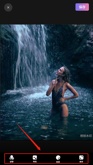 3、在这里可以选择滤镜、特效、贴纸和画布进行图片调整,