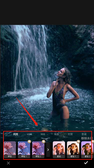 4、例如在特效中有闪光、vcr、90s和海报等各种滤镜,你可以选择自己喜欢的特效来修改图片,
