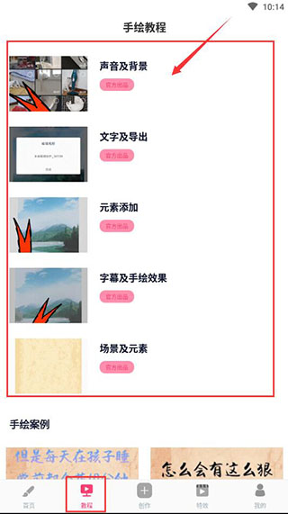 手绘视频式一款专业的制作手绘视频涂鸦视频的App,而该软件也为新手用户们提供了手绘教程,一起来看看如此观看这些手绘教程吧!1、进入软件后,点击教程页也可以看到许多的手绘教程视频;