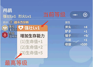 当前等级:角色所有羁绊的总和,比如你装备一只强壮Lv1+强壮Lv2的宠物,就会获得强壮Lv3的效果,生命值+5。