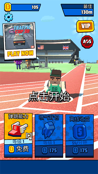 1、游戏开始前可以配置弹跳能力,喷气背包和离线收益,准备好了后点击开始即可