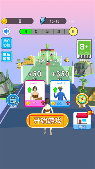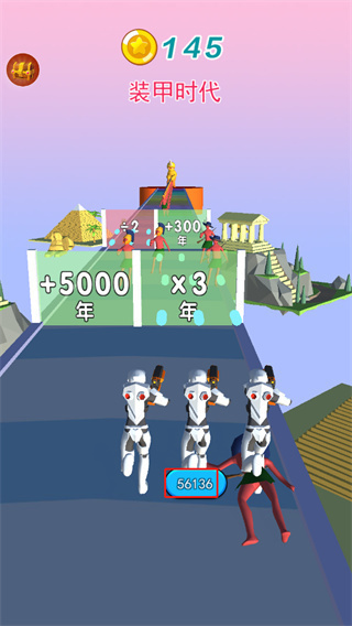 未来战士进化最新版是一款非常有趣的休闲闯关游戏,精美清新的画面,全新休闲的主题,配色和流畅度都是精心设计的,给玩家带来了一场无与伦比的视觉盛宴。该作主要以人类的进化史为题材,玩家需要从普通的原始人开始,不断前进奔跑,在赛道上通过增加对应年限使人类从石器时代不断的进化到到机甲时代,通过拾取和选择增益道具进化成未来的高科技人。游戏中每个关卡都是都是经过精心设计的,都有不同的跑酷任务,等着玩家来完成,跑道中还有着更多的金币等你收取,可以用来购买更高阶层的武器装备,帮助你的角色快速得到升级,让武器也达到一个新的层次。