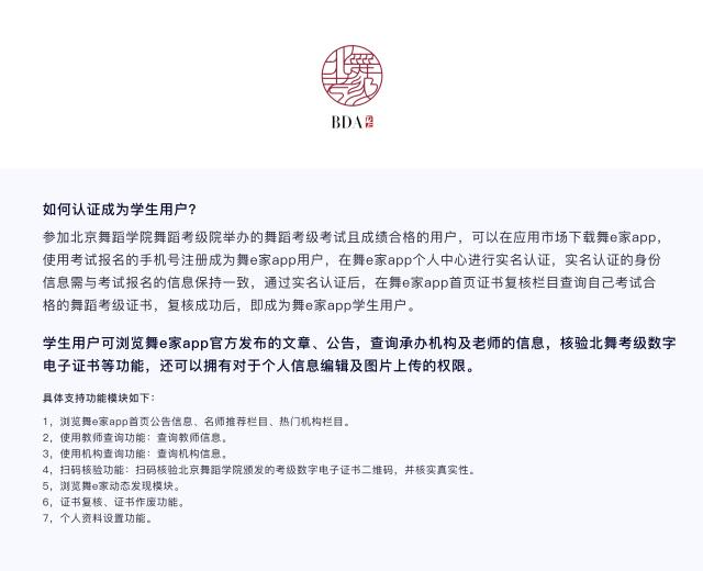 学⽣⽤户可浏览舞e家app官⽅发布的⽂章、公告,查询承办机构及⽼师的信息,核验北舞考级数字电子证书等功能,还可以拥有对个⼈信息编辑及图⽚上传的权限。