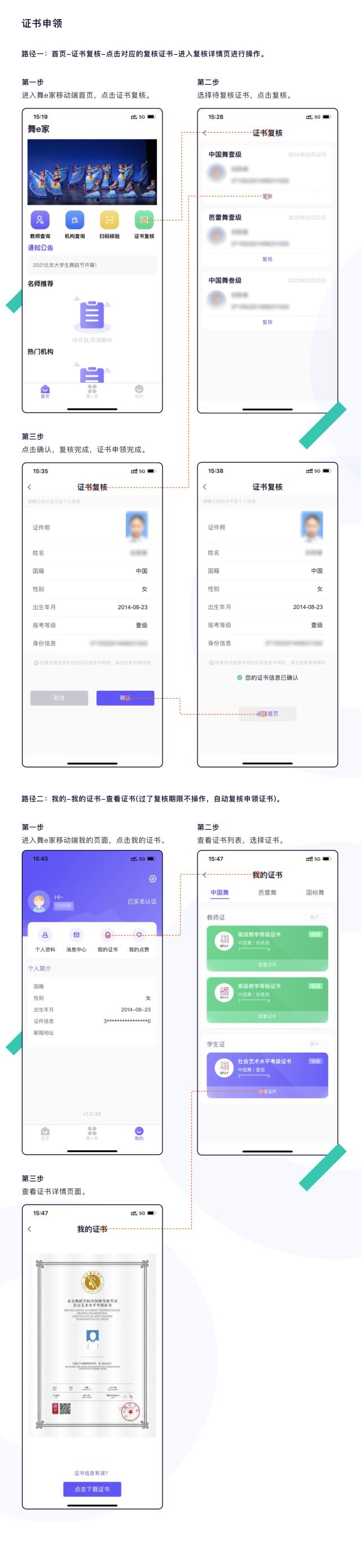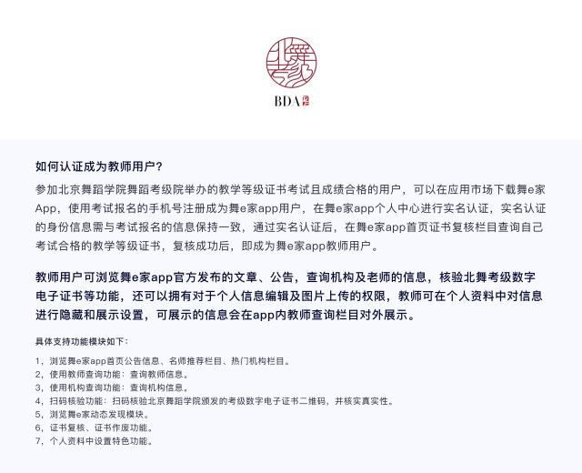 参加北京舞蹈学院舞蹈考级院举办的舞蹈考级考试且成绩合格的⽤户,可以在应⽤市场下载舞e家app,使⽤考试报名的⼿机号注册成为舞e家app⽤户,在舞e家app个⼈中⼼进⾏实名认证,实名认证的身份 信息需与考试报名的信息保持⼀致,通过实名认证后,在舞e家app⾸⻚证书复核栏⽬查询⾃⼰考试合格的舞蹈考级证书,复核成功后,即成为舞e家app学⽣⽤户。