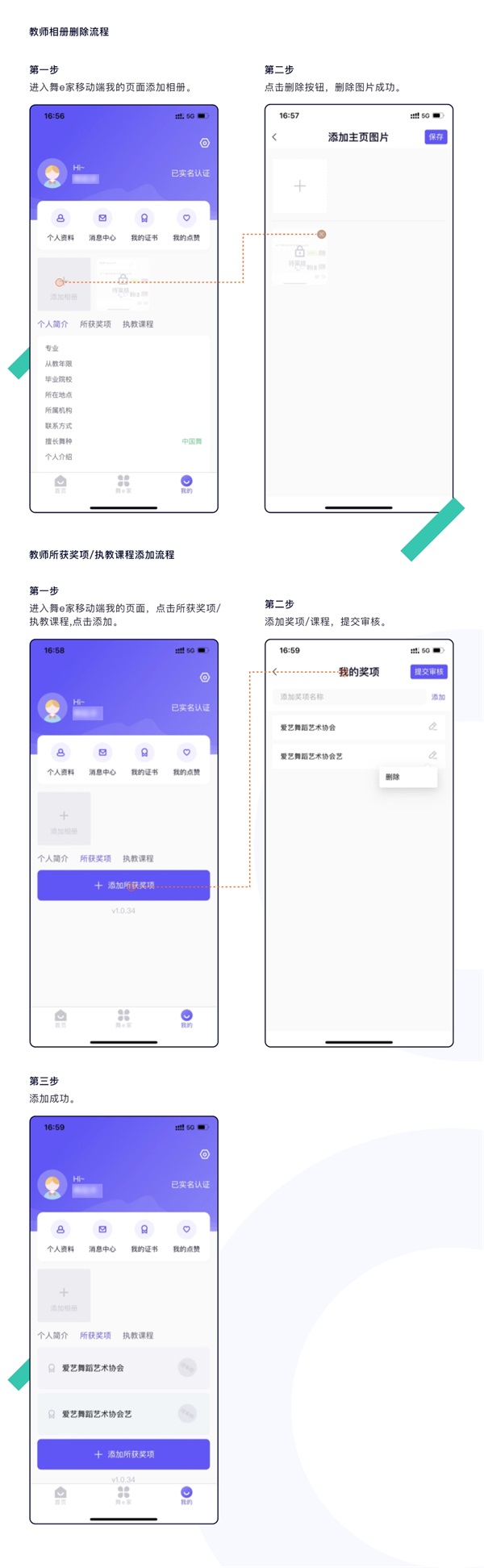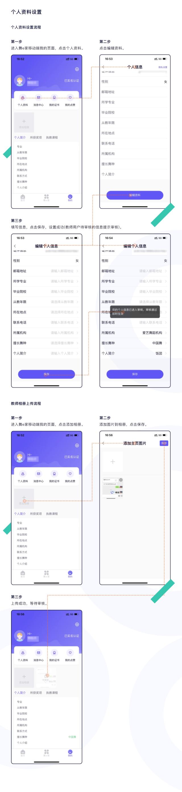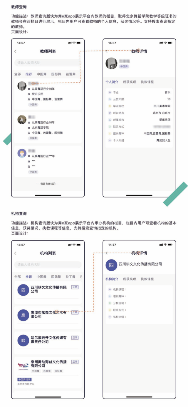 教师⽤户可浏览舞e家app官⽅发布的⽂章、公告,查询机构及⽼师的信息,核验北舞考级数字电子证书等功能,还可以拥有对于个⼈信息编辑及图⽚上传的权限,教师可在个⼈资料中对信息进⾏隐藏和展示设置,可展示的信息会在app内教师查询栏⽬对外展示。
