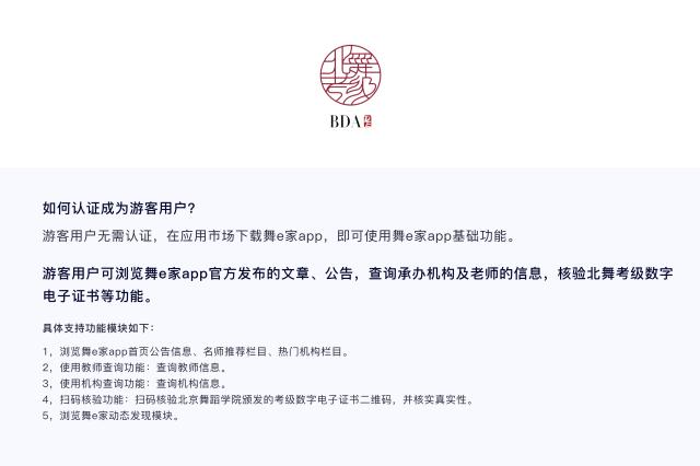 游客⽤户可浏览舞e家app官⽅发布的⽂章、公告,查询承办机构及⽼师的信息,核验北舞考级数字电子证书等功能。