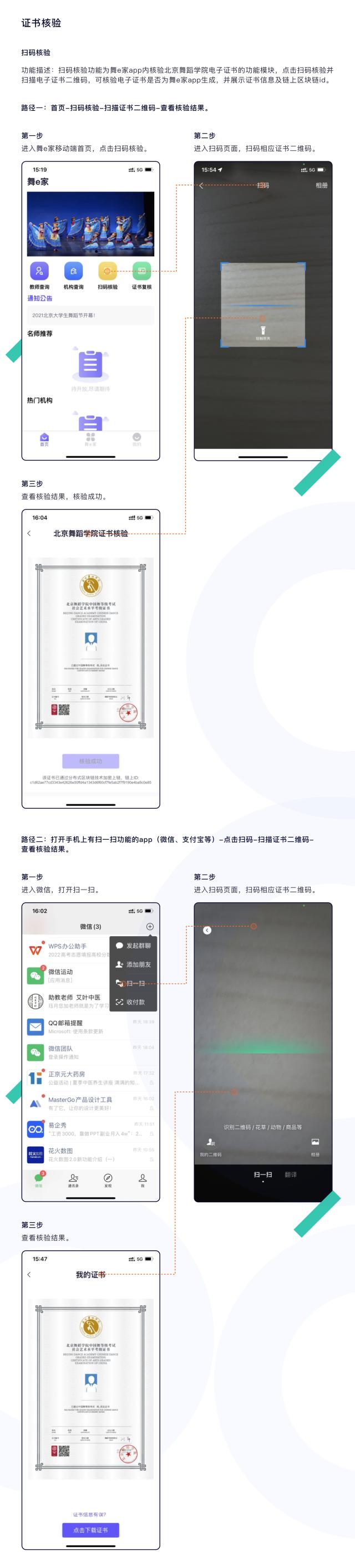 舞e家app官方最新版是一款服务于舞蹈学院考级学生,集学生对考级证书查询、电子证书管理、师生社交为一体的服务平台。系统核心电子证书模块依据从纸质证书到电子证书升级的需求,结合区块链架构,设计系统的电子证书管理模块,电子证书模块支持用户对证书进行扫码查验、复核确认,并生成电子证书。为学校实现考级证书的数字化提供支撑和帮助。