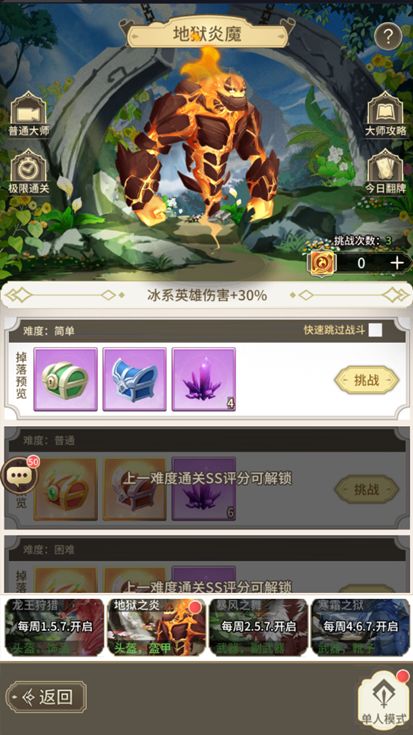每个BOSS关卡都有八个难度,分别为简单→普通→困难→精英→史诗→传说→炼狱→深渊,冒险者会从简单难度开始挑战BOSS,当前难度玩家达到SS评分后会解锁下一难度,难度越高掉落的装备星级越高。冒险者们要针对不同boss的弱点,选择合适的阵容挑战哦~