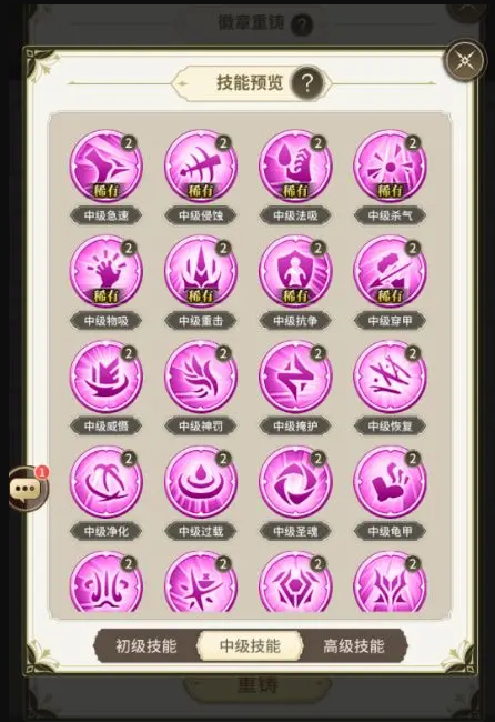 徽章技能按照属性强度分为三级:初级、中级、高级