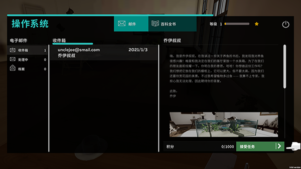 2、开始游戏后你会看到自己的邮件收件箱有新的任务,点击接受任务。