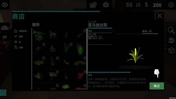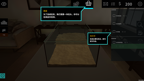 4、点击顶部商店,有各种各样的植物、石头、景观和鱼类等,根据任务目标选择对应的物品进行放置。