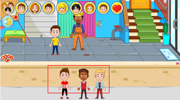 从游戏玩法来看,进入后会看到一个雪景城市,里面有各种建筑可以参观。点击左上角的人物头像就能召唤喜欢的角色,然后通过箭头进入不同房间,比如车库、后院、厨房等等,每个地方都有独特的玩法。比如在车库里修车、改颜色、贴 sticker,或者去后院游泳、跳花车,甚至在卧室里床上跳,玩玩具画画。