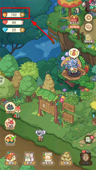 1、进入动物之星最新版游戏之后,首先我们需要获取很多橡子,相当于货币,后面可以帮助玩家建设更多设施。