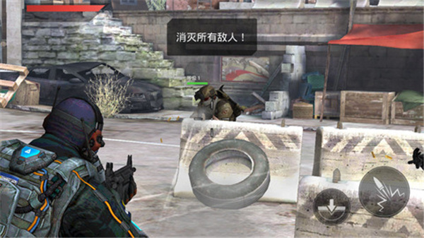 玩过火线指令系列的都知道,游戏的射击并不像传统FPS那样高自由度,跑、瞄准、射击、掩护,基本就是游戏的全部了。而此游戏更是将“自由”压缩到了极致,关卡的纵深被完全取缔了,固定的场景下,如今的跑不过是几个掩体之间的切换。整个游戏模式更像不久前Glu推出的机械战警,站桩式射击。不过如此简化,也使得有着丰富射击经验的Glu,在本作操作上更加得心应手,二代操作手感不错。只是可能由于咱的武器威力不够,子弹入肉感有待提高。