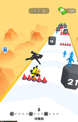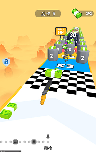 2、跑酷玩法造型有趣,游戏中在跑酷的玩法之外,让小人变身枪支的造型,酷炫又有趣,让游戏的玩法更加丰富。