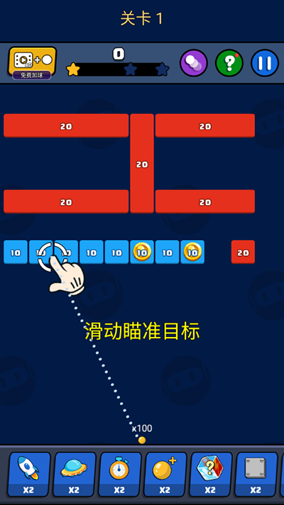 1、滑动瞄准目标,会自动释放小球,消所有砖块,才能获得分数和星星,如图所示