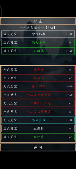 2、后期法宝选择一般为诛仙四剑,十二品功德金莲,十二品灭世黑莲/十二品业火红莲。