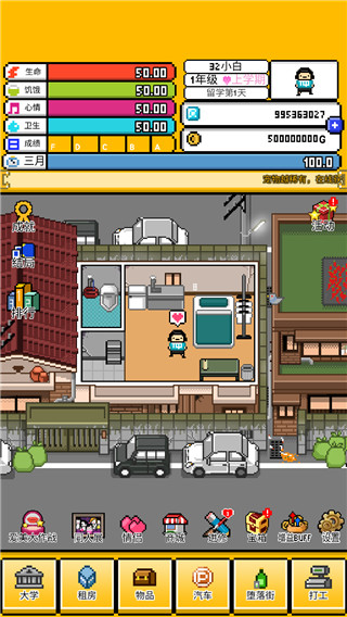 游戏的基础货币,可以用来升级家具、抽取道具、房租和学费结算等等。打工、租车均可获得。当金币栏变红时,标志着金币余额不足以支付学费或房租,月底结算时将会强制进入留学第一天重修。