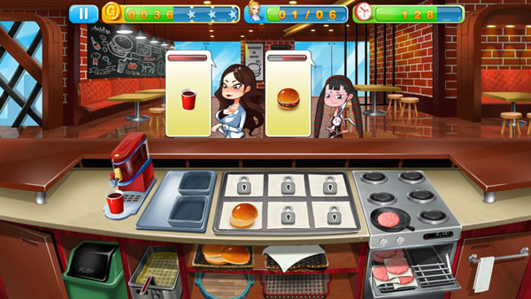 接下来是进入游戏画面,在下面图中你可以看到每名前来消费顾客的需求,针对不同的顾客你需要制作不同的美食来完成需求,从中获取的金币,可以在后续用来升级你的厨房,提升厨房厨具的工作效率,减少顾客的等待时长。