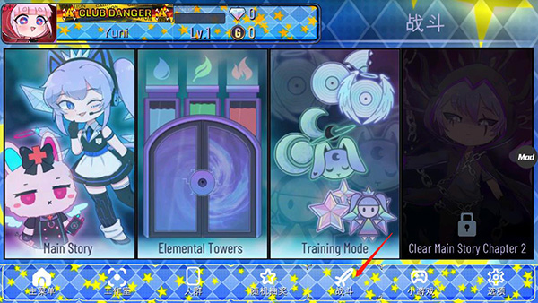 2、进入游戏后在下面可以看到主菜单、工作室、人群、随机抽奖、战斗、小游戏等功能;
