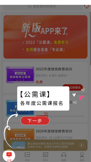 软件特色包括海量课程按需选择、优质视频教学资源、弹题检测避免挂机、在线学习记录学时等功能。用户可以通过“公需课”和“专业课”页面进行报名学习,已报课程可以在“学习”页面进行 playback。在“我的”页面,用户可以下载学习证书或申请发票。
