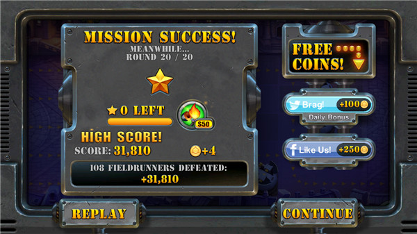 每个关卡结束过后,依据玩家获得的星星评级和分数来进行硬币的计算加成。而每个关卡获得的星星也是一个非常重要的指标。因为该计量单位是解锁本作所有炮塔的一个首要条件。玩家只有完成高等级难度下的关卡,获得更多的星星才能解锁新的炮塔。