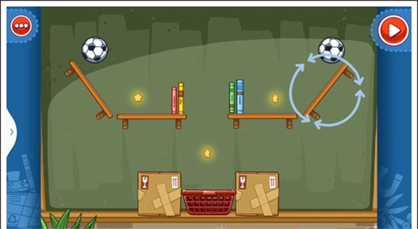 我们只需要将两个板凳放入图中所示位置,和一个气球放在那个书本底下,就可以让球滚下,获得星星。