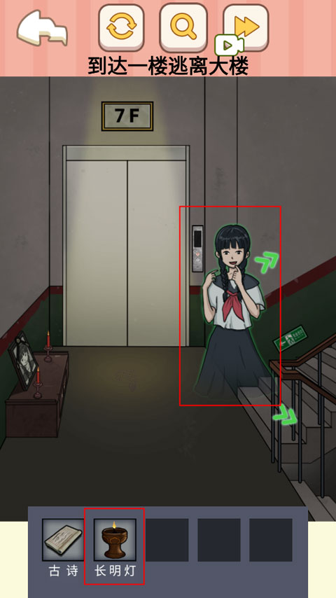 4、在八楼的垃圾袋中获得打火机,并用打火机点亮长明灯,选择小女孩没有被挡住的那个楼梯。