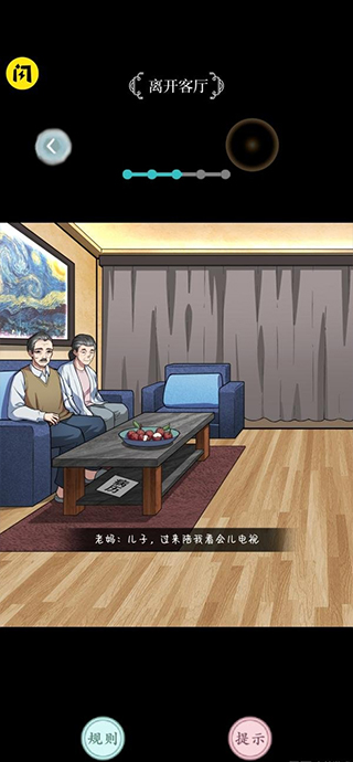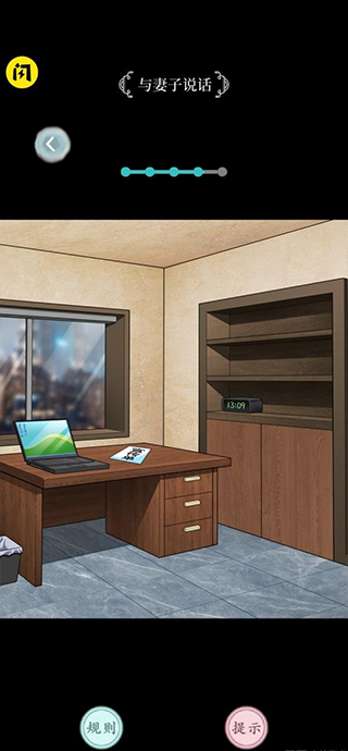 点击垃圾桶,点击下面的抽屉,把抽屉里的螺丝刀移到电子表上,点击电子表把时间调到零点几分,然后点击房间的门,妻子会出现,把她头上的发夹移到桌子上,然后点击她手里的汤,等灯光一闪,点击桌子下面的纸条,点击窗框上面的窗帘,点击笔记本,等妻子回答,然后点击宣传单。然后你就可以进入最后一关了。