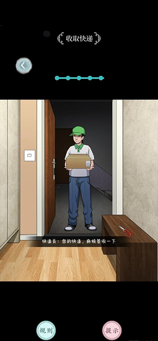 玩家需要点击门,通过点击左边的开关打开灯,把剪刀拖到快递上,然后点击里面的纸条,就可以通关。