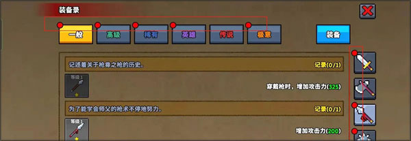 2、进入装备录界面,可以看到不同种类和等阶的装备可以进行记录,可以完成记录的会有红点进行标识;