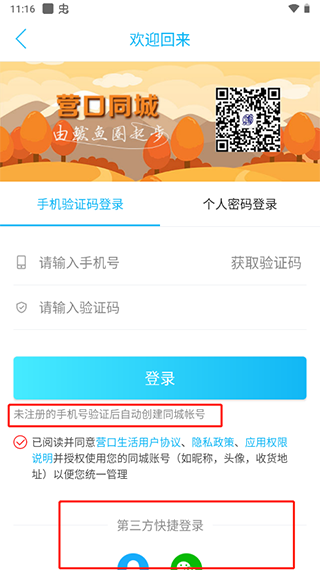 3、直接输入手机号获取短信验证(未注册的手机号验证后自动创建同城账号),或者也可直接使用第三方账号登录