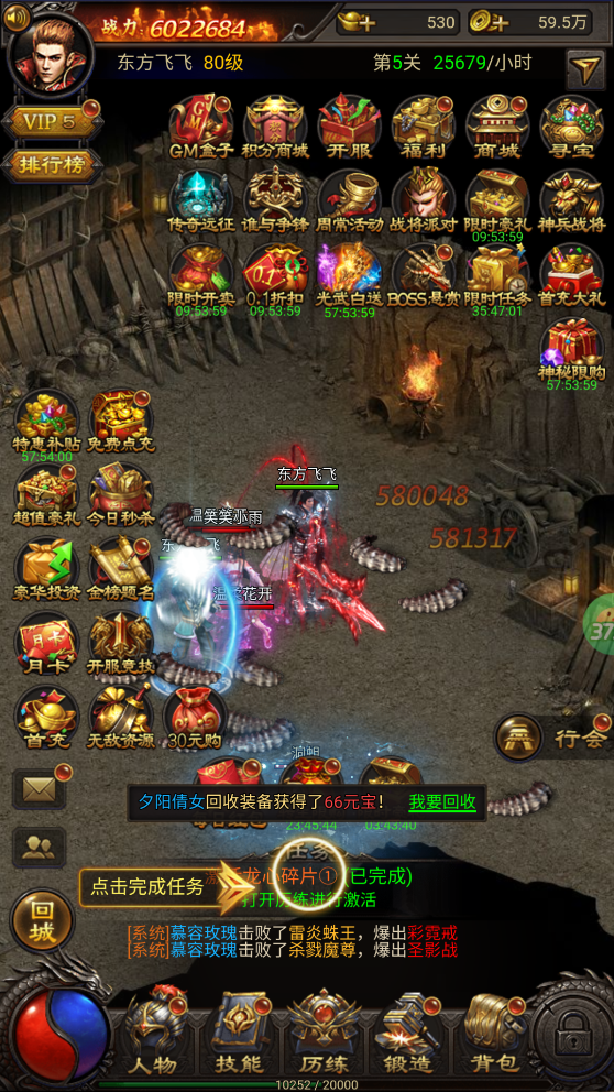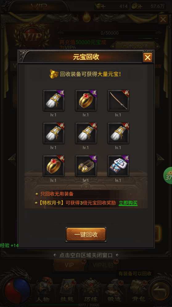 不需要的装备可以进行一键回收,回收还可以获得大量元宝