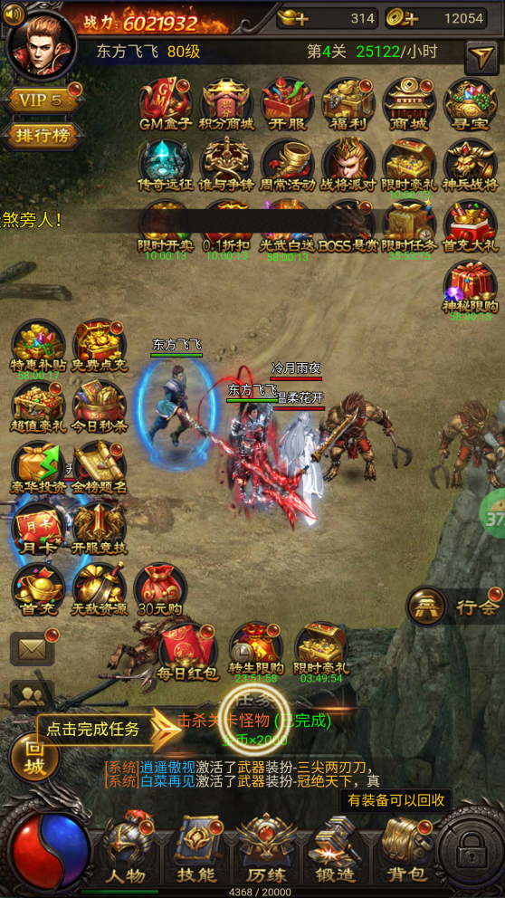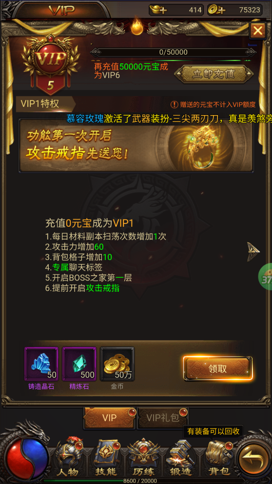 进入游戏后,新手可以跟着任务走,刷怪升级很快就能发育起来。不需要的装备可以直接回收,还能获得大量元宝。玩法丰富多样,既有击杀怪物赚金币和经验,又有各种活动和BOSS挑战,福利更是多到领不完。