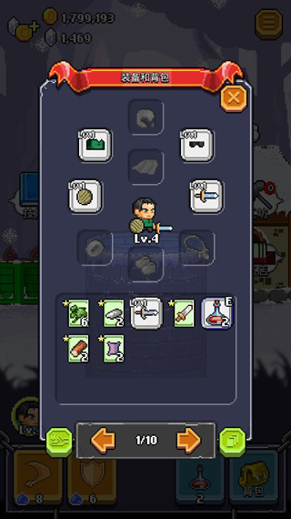 4、我们点击右下方“背包”后会出现一个角色总览界面,在上方是我们“英雄”的全身配置,蕉君看了一下,装备配置设置挺齐全的,大到武器装备,小到手环项链。当我们获得新的武器装备后就可以在背包界面进行点击替换,从而装备上新的武器提升我们的攻击力,不过千万不要像蕉君这样连项链都没的“英雄”。在下方会有一排排物品,这就是我们在实战之中打怪获得的物品,其中有可以升级武器的材料,我们也可以把不需要的物品进行出售获得金币。