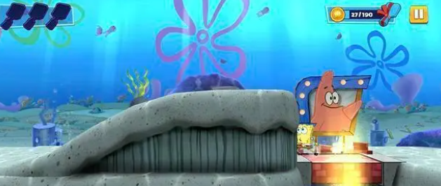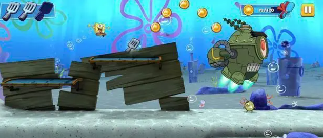 4、在每一个关卡的最后,玩家都必须和该场景的皮老板表兄弟来一场PK 赛!游戏过程中除了要躲避一系列障碍物以外,表兄弟们会在与海绵宝宝的追逐过程中投放爆炸物,玩家可以通过「冲刺」技巧来把这些爆炸物撞回给表兄弟们。当表兄弟们下方血条归零时,挑战就成功了!