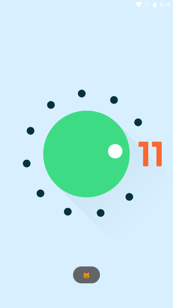 3、Android 11:点住白色按钮进行旋转,转到下图位置,会出现【11】的字样,转盘下边出现小猫的头像,就开启了安卓11的云养猫彩蛋。