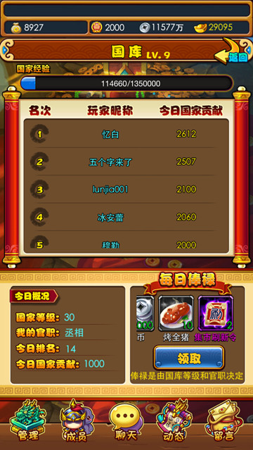 游戏里还有国库、国宴和国家书院这些特色系统。国库每天都能领福利,俸禄内容挺丰富的;国宴需要君主开启,参加还能获得各种奖励;国家书院可以提升所有武将的属性,升级会消耗资源,退出国家的话技能等级还能保留。总之,游戏设计得很全面,玩法多样又创新。
