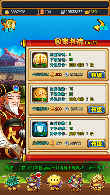 玩家可以在这里升级技能,永久提高所有武将的属性。分为攻击、物防、法防、生命。升级会消耗银币和个人贡献。