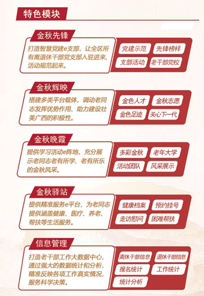 广西离退休干部综合服务管理平台是由自治区党委老干部局和中国联通广西分公司联手打造的一个一站式服务平台,专门服务于广西省的离退休干部。这个平台分为电脑PC端和手机APP端两部分,通过建立基础数据库和党建、活动、服务主题共享数据库,为老干部提供全方位的服务。