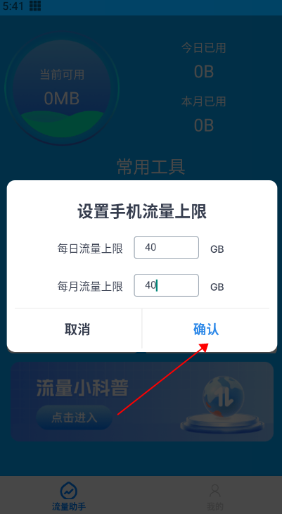 1、打开在本站下载好的软件,设定下每个月自己有多少流量可以用,超过了本应用会帮你限额。