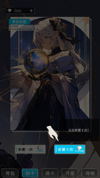 1、打开二次元氪金抽卡氪金模拟器,直接送你十次抽奖机会!点击祈愿抽卡吧!