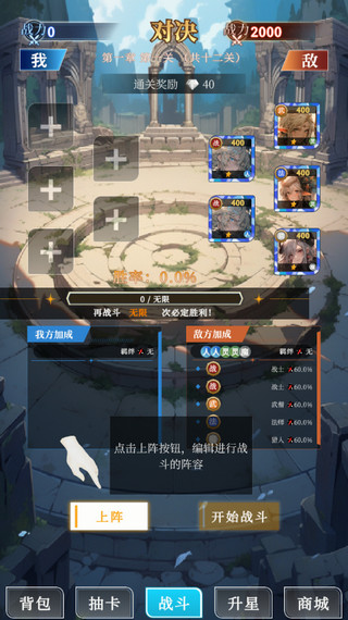 6、光好看可不行,点击战斗模式,你可以在这里上阵五张卡牌,看看实力如何!