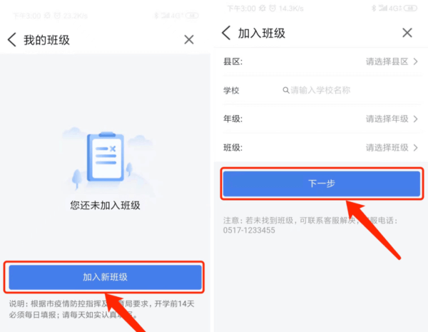 2、点击加入新班级,选择县区—所属学校—班级—点击“下一步”,如下图界面所示。