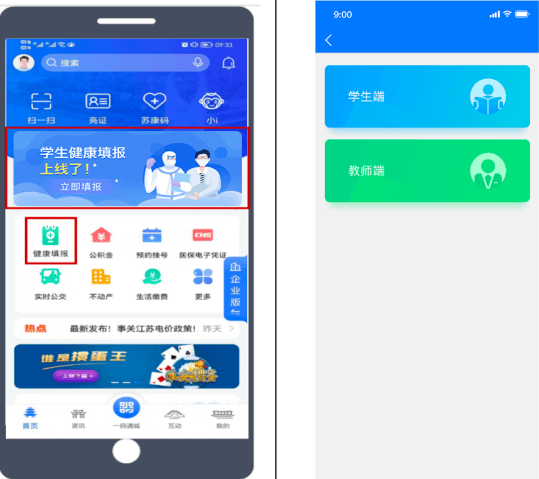 1、下载注册“i淮安”APP,点击首页“学生健康填报”中“学生端”,如下图界面所示。