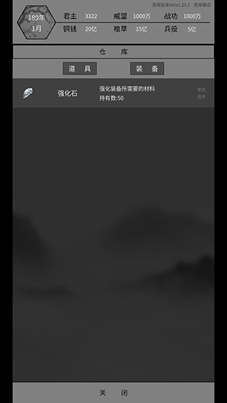 6、【仓库】:该入口下可以查看玩家自身所拥有的各项道具和装备,每个道具后还会显示简短的说明和所持数量。