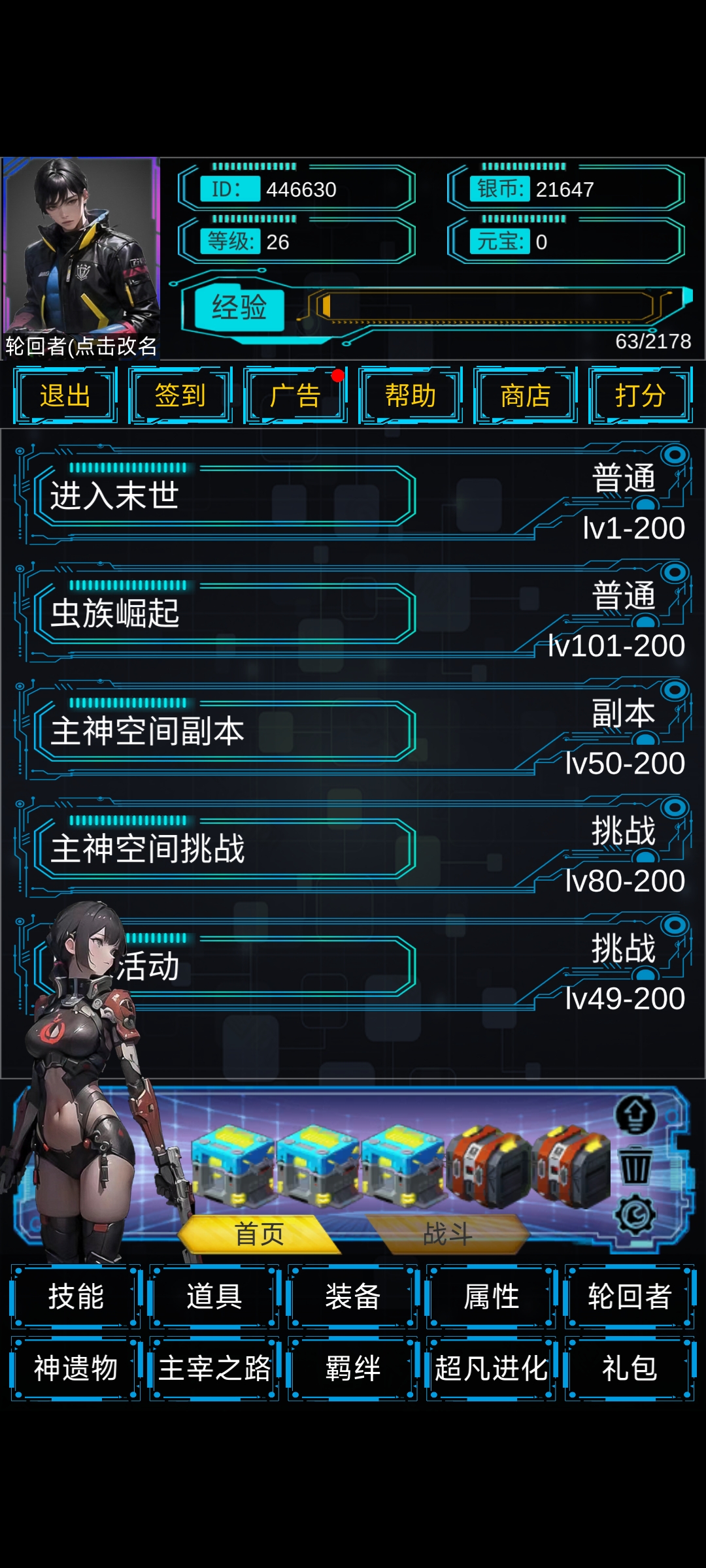 主神无限空间是一款非常好玩的文字类放置挂机小游戏。相比其他的挂机游戏,主神无限空间增加了服务器挂机系统,全部的战斗计算和奖励的获取都会在服务器端自动运行,手机无需打开游戏,无需后台运行,甚至手机关机都可以。服务器会根据你最后一次进入游戏的时间开始,自动在服务器端挂机24小时。即使中间遇到了服务器维护的情况,也会自动恢复战斗。因此,战斗开始后,你就可以放心的、安心的去干别的事情,无任何后顾之忧。游戏以虫族末世为背景,你将开启你的末日挑战之路,无限穿越,无限挂机,无限宝箱,无限BOSS,无限可能!